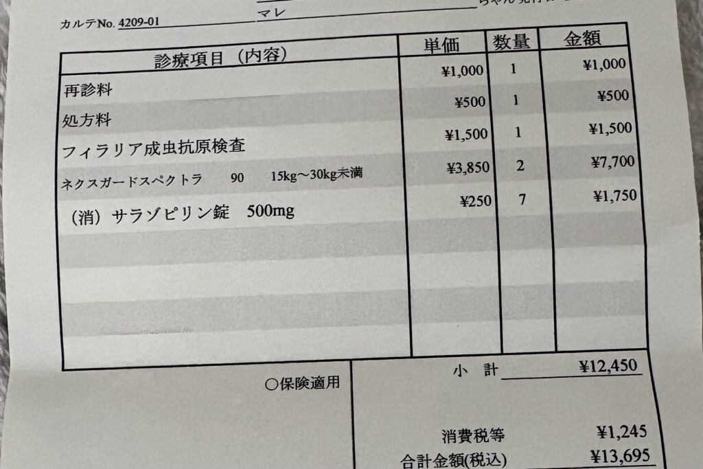 – 費用:3,575円(フィラリア検査とネクスガードは除く)