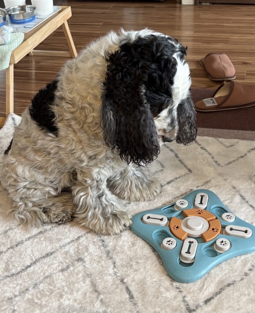 仕事中うるさい時用に、オヤツを隠せるパズルを買いました。将棋指してるみたい…